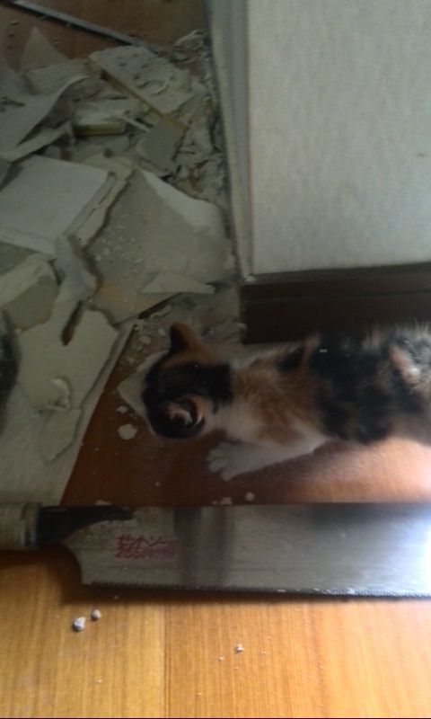 日常現場であったことや、お客さんとのお話など、たまに書きます。 壁からニャー! 今朝お客さんから通報!?を受けて現場へ急行! なんと壁の中からニャーニャーと鳴き声が やむなく大工さんに壁を開けてもらうことに・・・ 出てきました!子ネコです。 どうやら天井裏に忍び込んで、壁のスキマに落ちたみたいですね~。 「すいませんでしたね~」と奥さん。 いえいえ、スイマセンは、このネコですよ~。 困ったことがあれば、㈲須田工務店にお任せ下さい!!(笑)